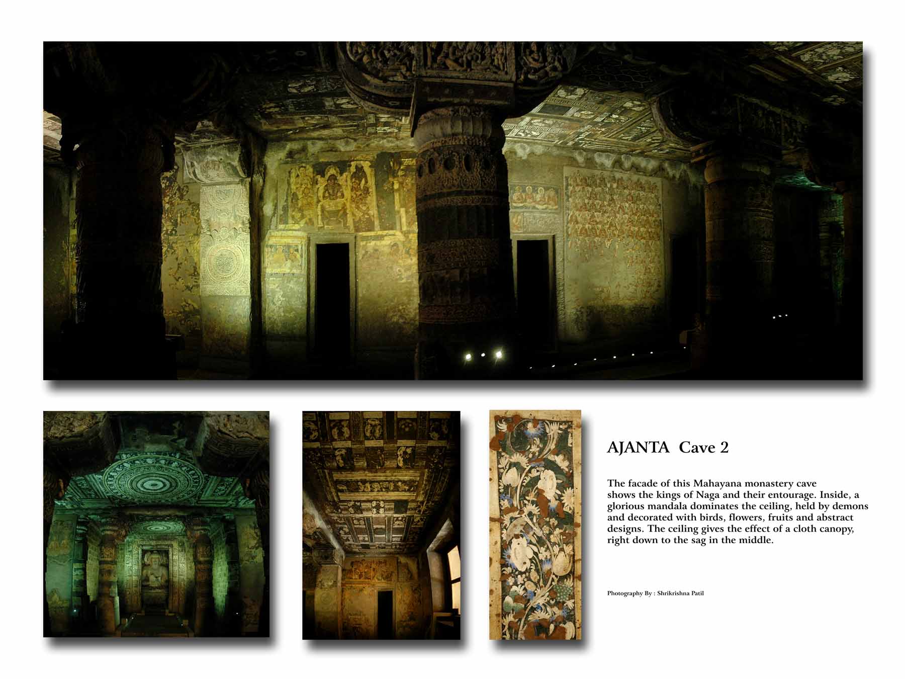 • The first cave was built on the eastern end of the horse-shoe shaped scarp. According to Spink, it is one of the latest caves to have begun on site and brought to near-completion in the Vakatka phase. Although there is no epigraphic evidence, it has been proposed that the Vakataka king Harisena may have been the benefactor of this better-preserved cave. A dominant reason for this is that Harisena was not involved initially in patronizing Ajanta.