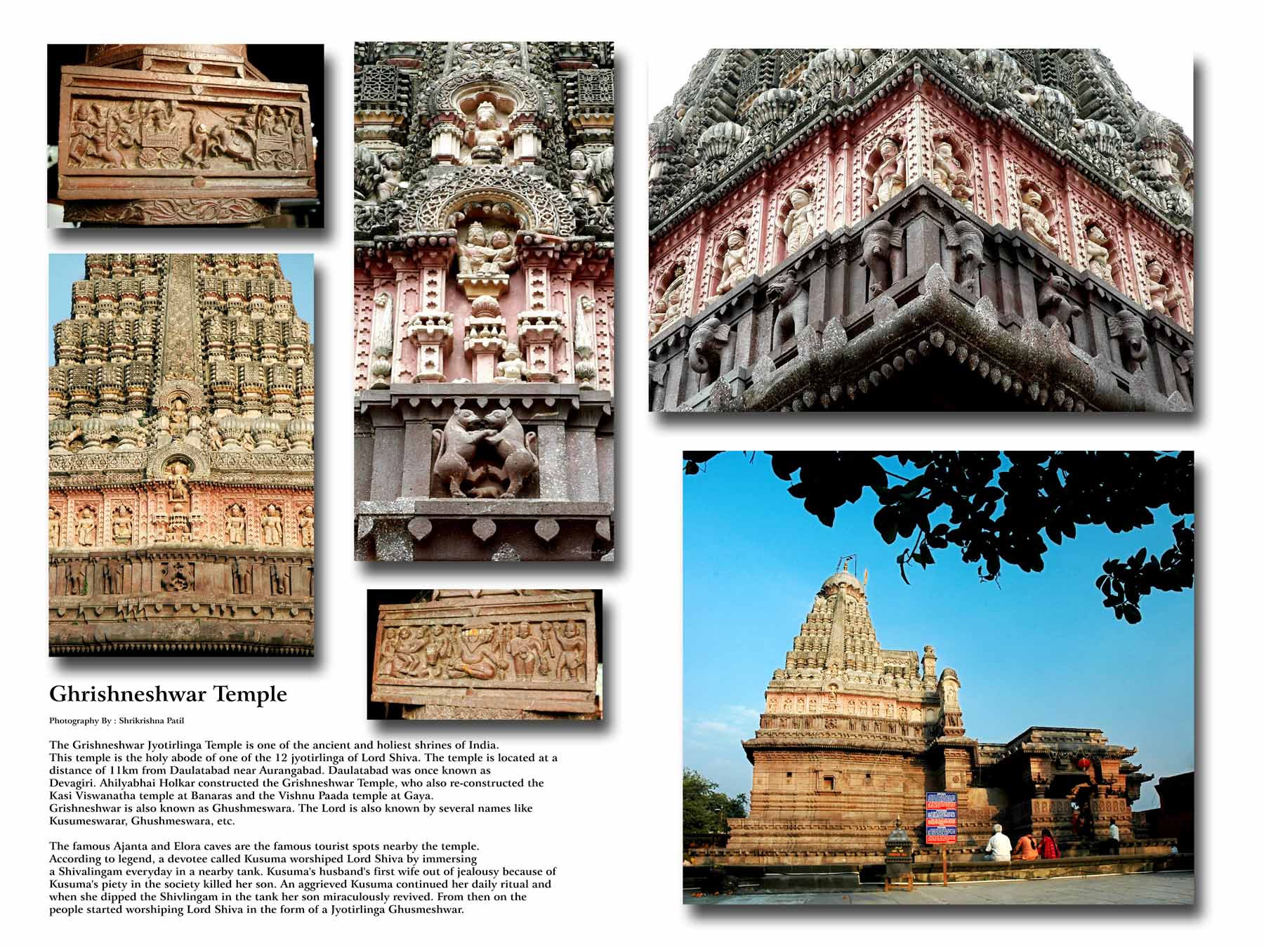 The Grishneswar temple was re-constructed by Maloji Raje Bhosale of Verul, (grandfather of Chhatrapati Shivaji Maharaj) in the 16th century and later by Ahilyabai Holkar in 18th century, who also re-constructed the Kashi Vishwanath temple at Benares, and the Vishnupad Mandir at Gaya.